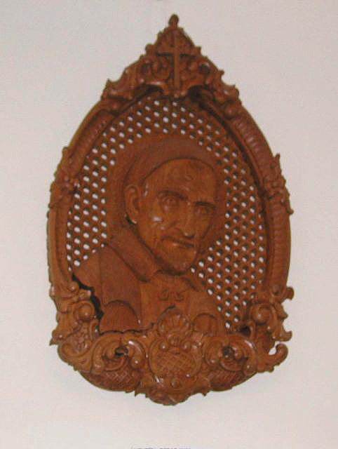 Wall mounted teak plaque from Indonesia; head of Vincent de Paul. Original in Vincentian motherhouse, Panningen