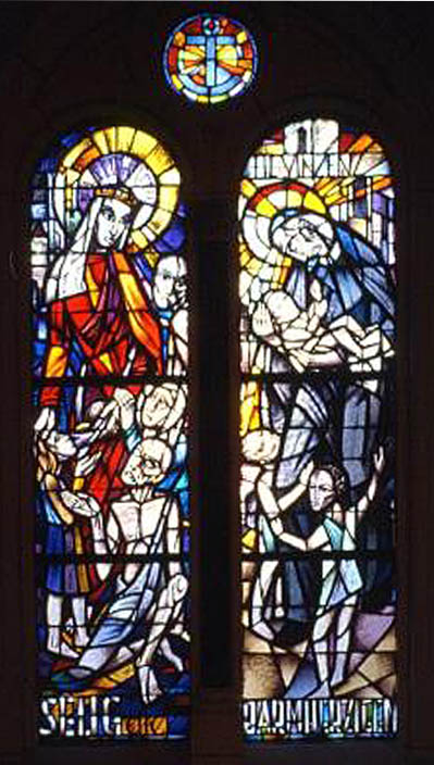 German text: Blessed are the merciful. Probably Elizabeth of Thuringia (left), Vincent de Paul (right)Internet image