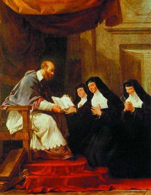 Oil on canvas; Francis de Sales, cassock, rochet, mozzetta, gives rules to Sisters of Visitation; for comparison with Vincent de Paul giving rules; location of original unknown