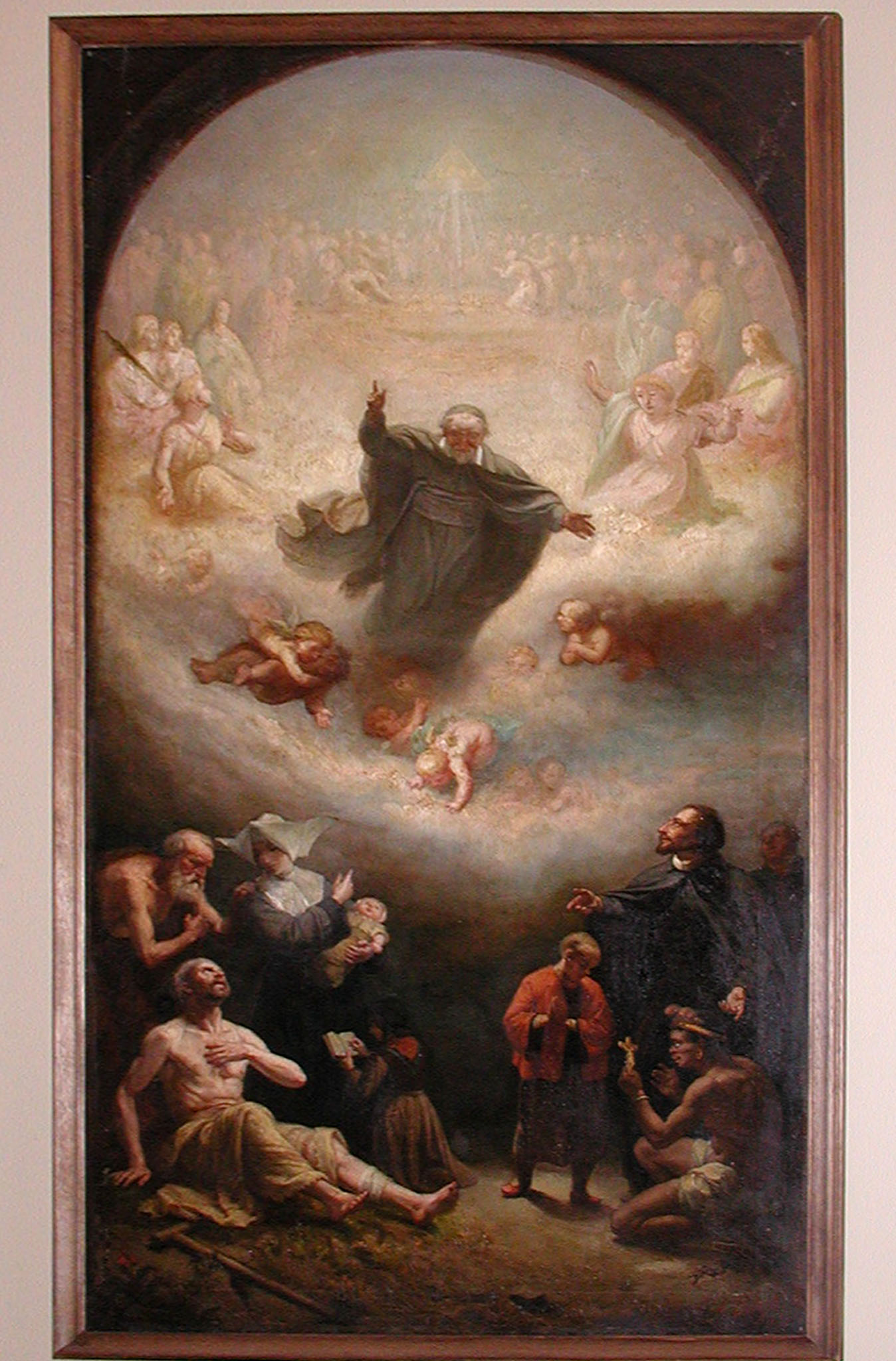 Oil on canvas; Vincent de Paul, standing, cassock, cincture, mantle, skullcap, as patron of charitable works; Daughter of Charity, priest, poor persons below; original in Vincentian mother house