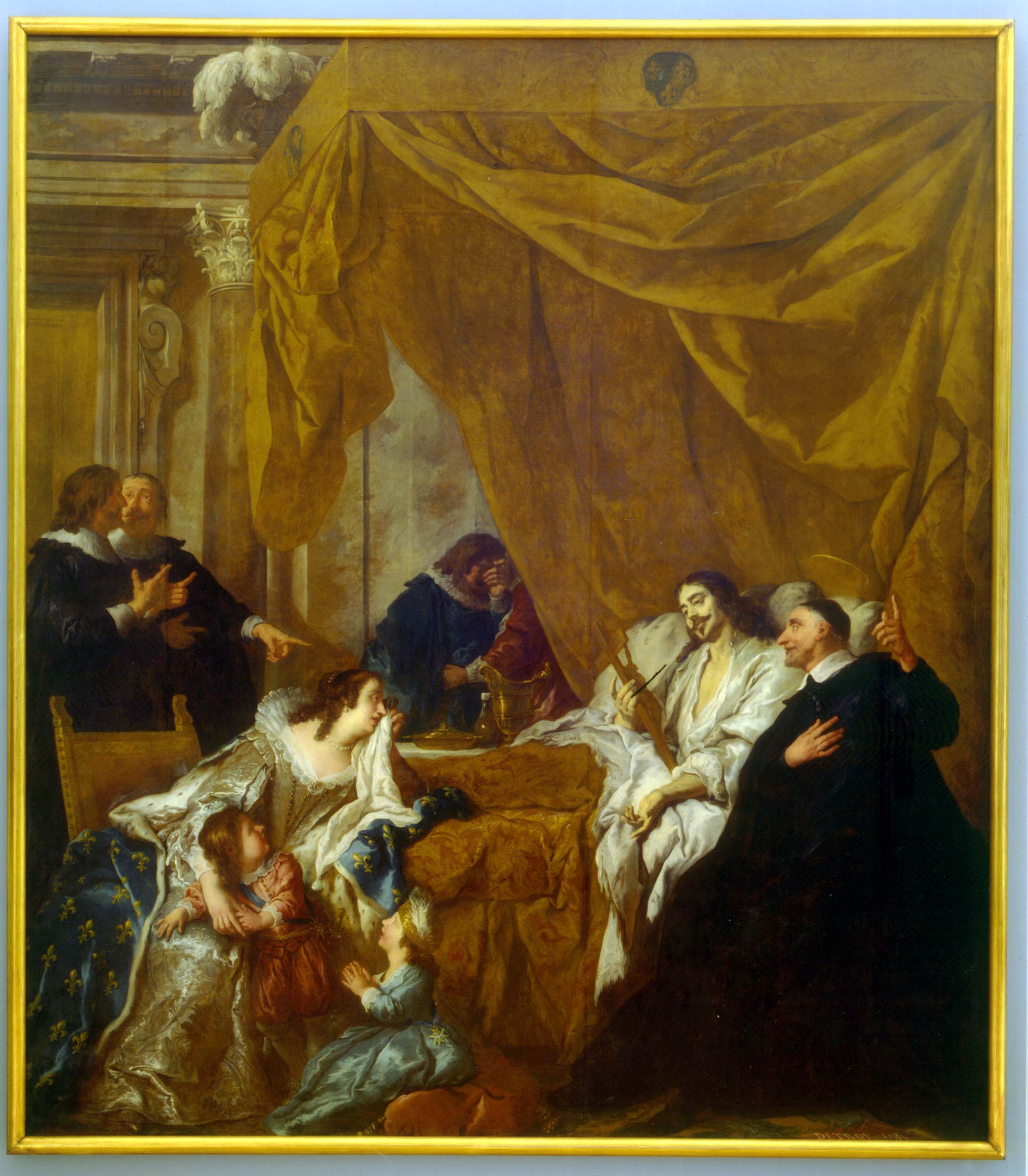 Oil on canvas; Vincent de Paul, seated, cassock, mantle, skullcap, halo; at deathbed of Louis XIII, holding crucifix; queen and childen, others; original, by Jean-François de Troy, for canonization series, in museum in Copenhagen