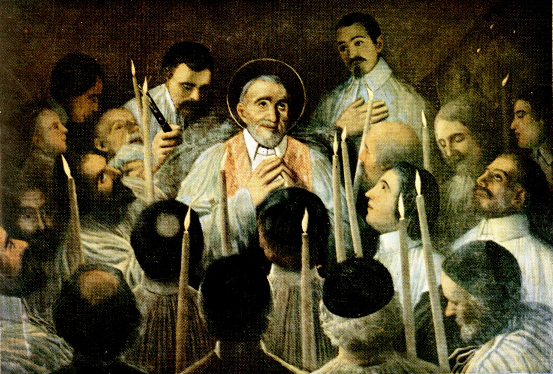 Oil on canvas; Vincent de Paul, seated, cassock, surplice, stole, halo; surrounded by priests and brothers of the Mission, some with candles; original in Vincentian mother house; painter, Bro. François Carbonnier