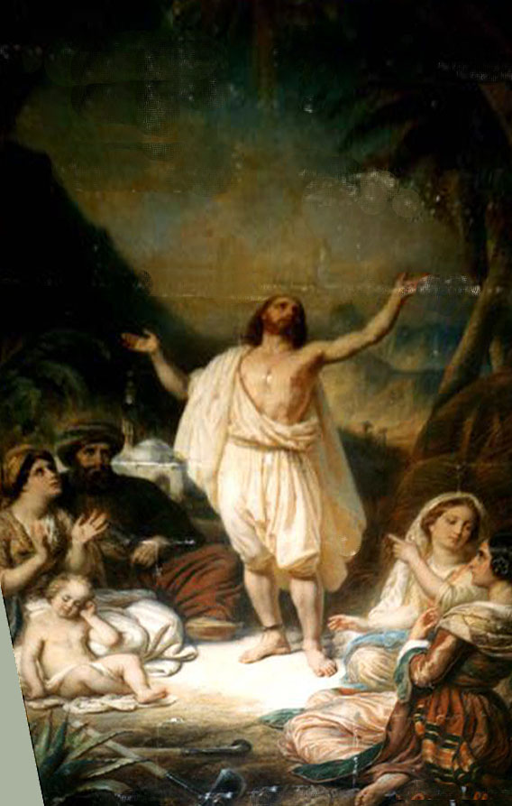 Mural; Vincent de Paul, standing, white clothing, ankle chain, bare chest, man and three women, child in outdoor setting, mosque in background; original in St. Merri