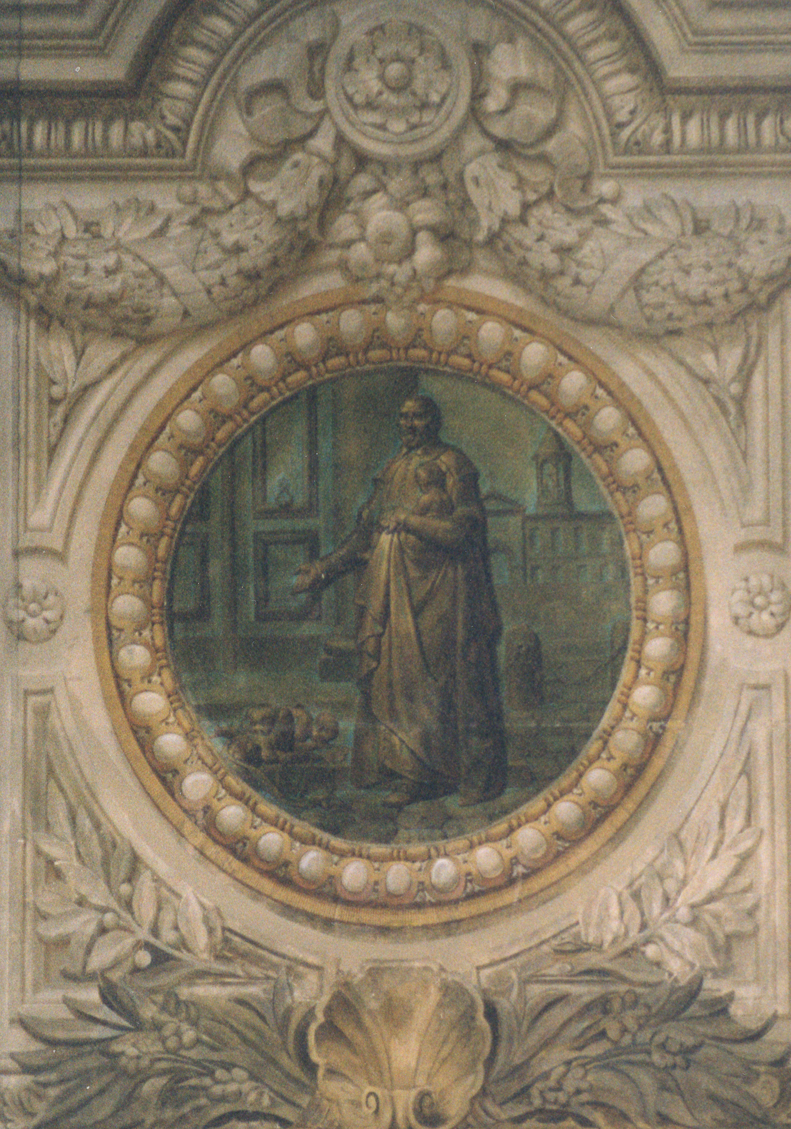 Mural; Vincent de Paul, standing, cassock, mantle; holding child, gesturing to abandoned child; mother in background; original in St. Thomas Aquinas