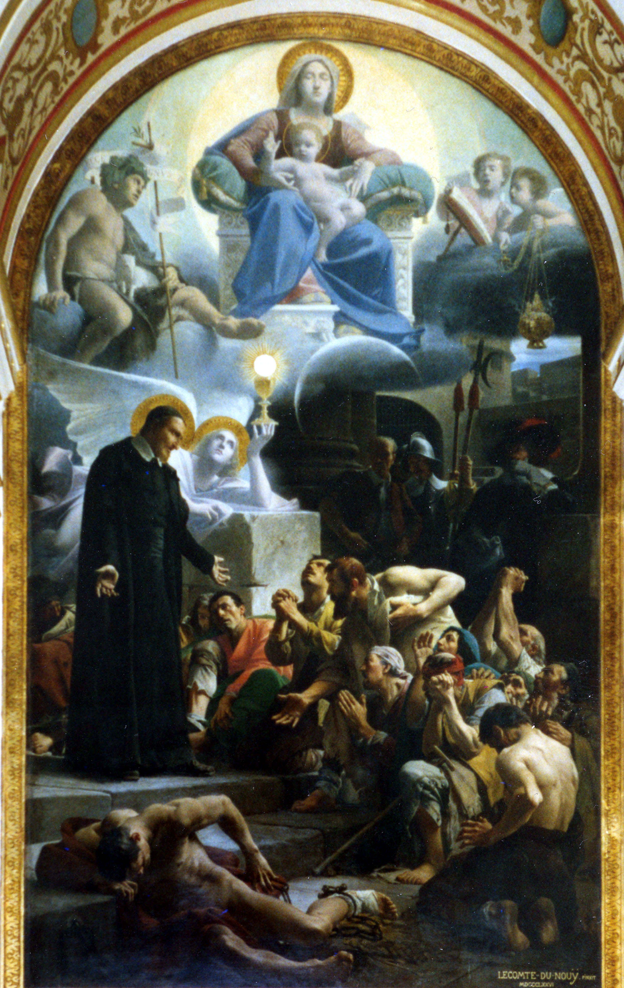 Oil on canvas, Vincent de Paul, standing, cassock, mantle, skullcap, halo; welcomes destitute Lorrainers; work of LeComte de Nouy, original in La Trinité