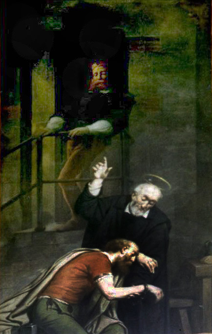Oil on canvas; Vincent de Paul, standing, cassock, shirt sleeves visible, halo; with galley prisoner, guard in back; original in St. Bernard de la Chapelle