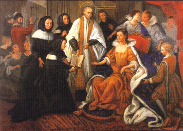 Copy of original by Jean-François de Troy in Ste. Marguerite; Vincent de Paul, standing, cassock, surplice, stole, halo; presents rules with foundress, Mme. de Miramion, to Anne of Austria