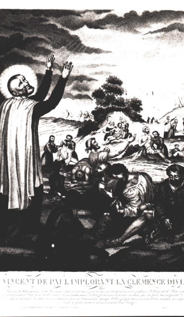 Vincent de Paul, standing, cassock, surplice, arms raised in prayer; priest and Daughters of Charity help wounded soldiers