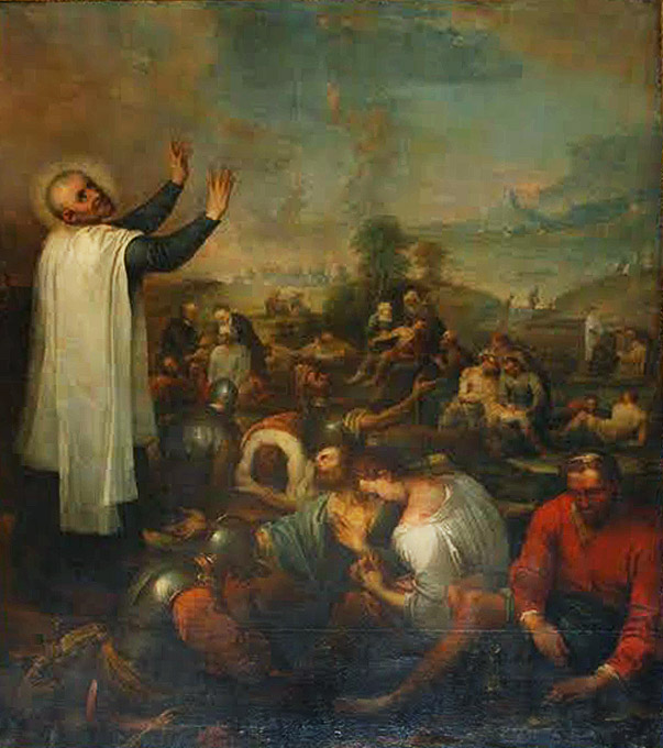 Oil on canvas; Vincent de Paul, standing, cassock, surplice; priests and Daughters of Charity caring for wounded on battlefield; artist: Baptiste Feret; part of canonization series