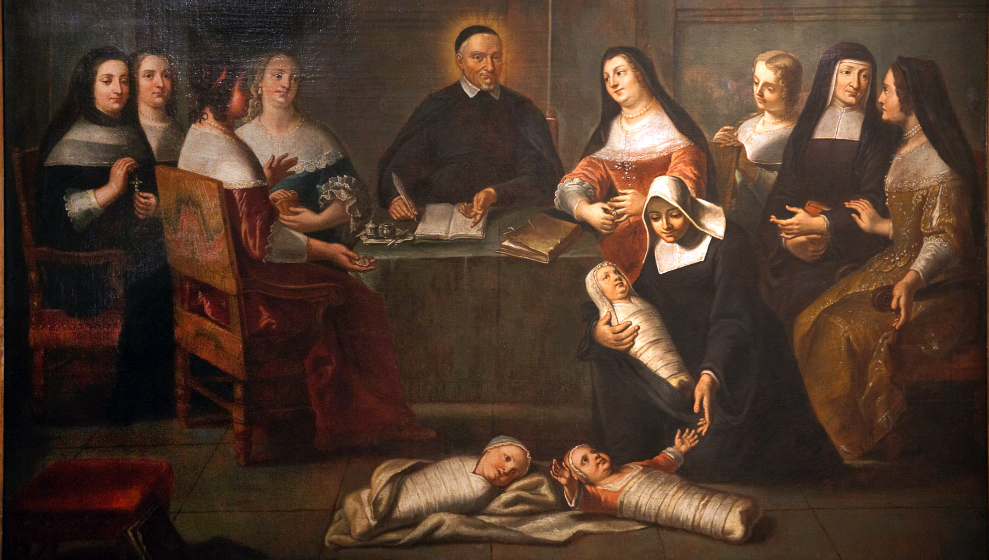 Recognizable: Mme de Miramion, D'Aligre, duchess of Aiguillon, giving jewels to SV for the foundlings