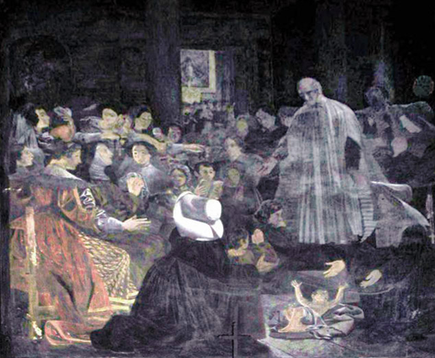 Fresco; VdP , standing, cassock, Paris surplice, addressing Ladies of Charity, with Daughters of Charity and infants; original in St. Vincent chapel, St. Sulpice; artist: Alexandre-Charles Guillemot, 1824-25