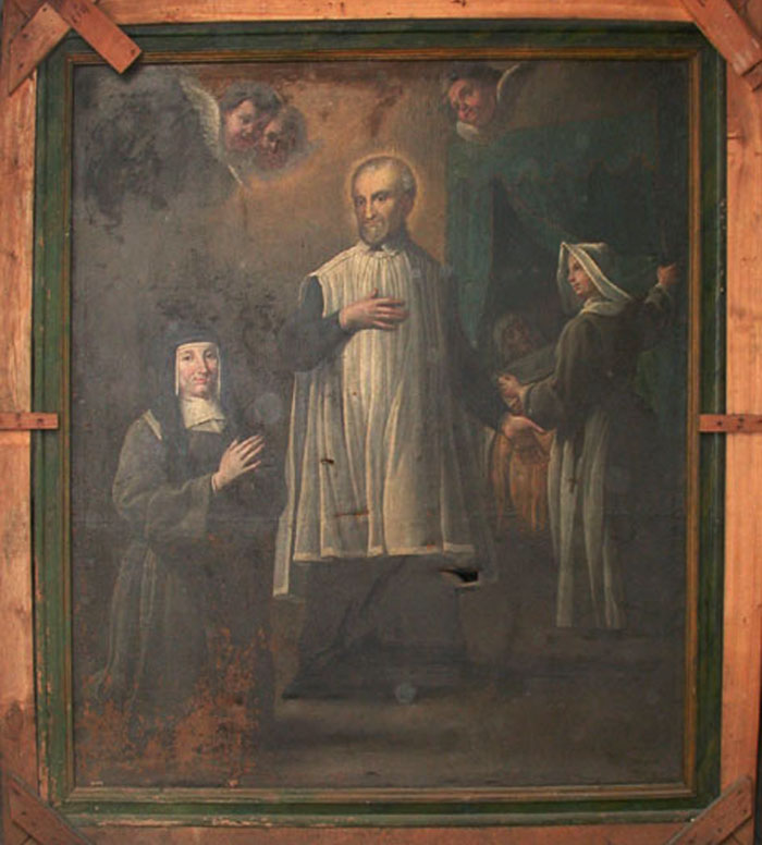 Oil on canvas; Vincent de Paul, standing, cassock, surplice (no stole, skullcap), with Louise de Marillac, kneeling; Daughter of Charity at bedside of sick person; 18th century; location of original unknown, maybe Spain