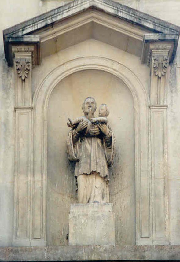 Stone; Vincent de Paul, cassock, surplice, holding child; in niche near former office of Public Assistance, a corner of rue de la Parcheminerie and rue Boutebrie