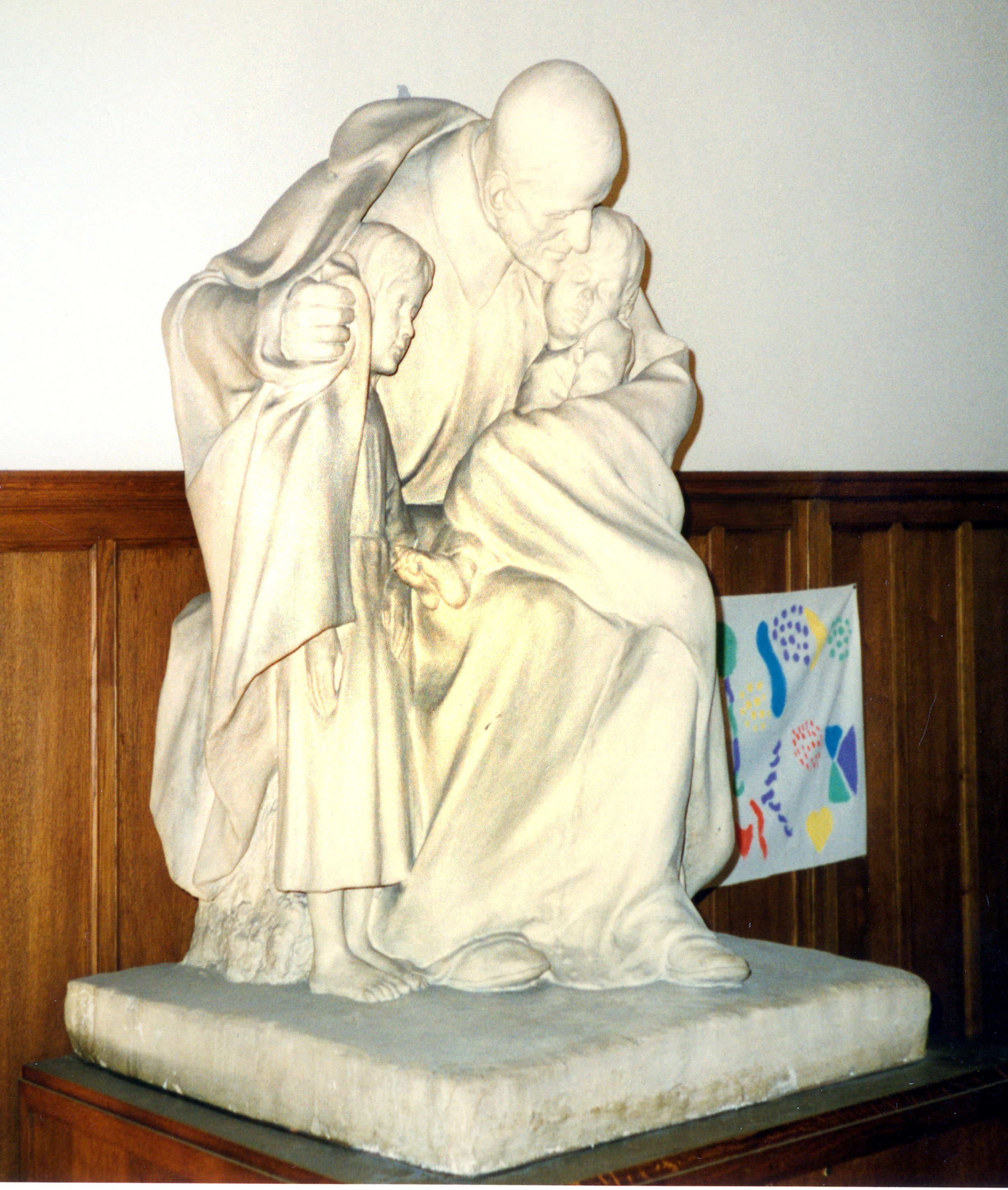 Marble statue, Vincent de Paul, seated, cassock, cape, skullcap, sheltering two children; original in St. Vincent de Paul hospital
