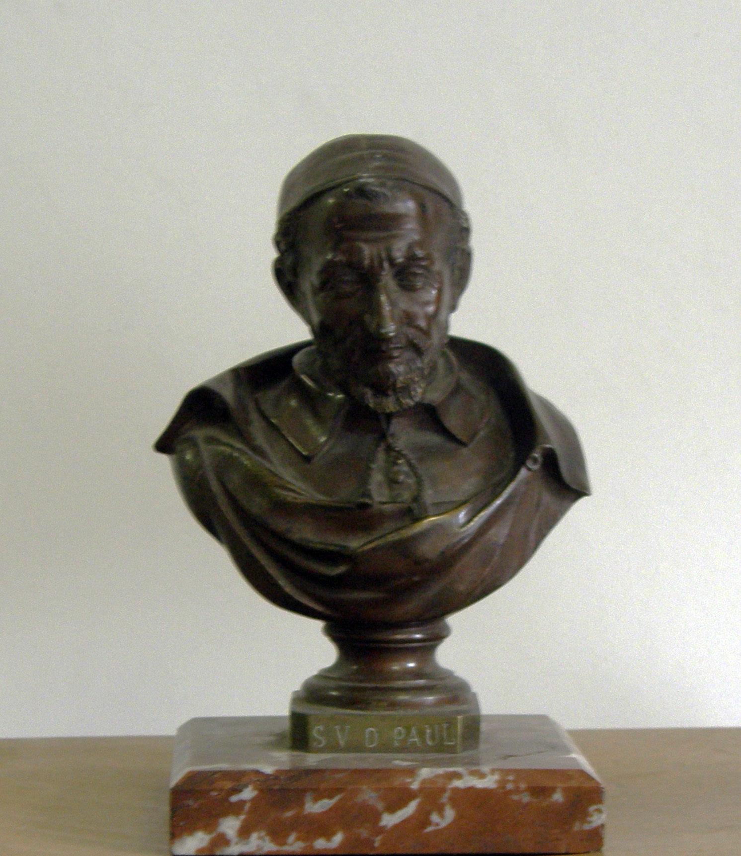 Bronze bust on pedestal, Vincent de Paul, bust, cassock, cape, skullcap; original in Vincentian maison mere