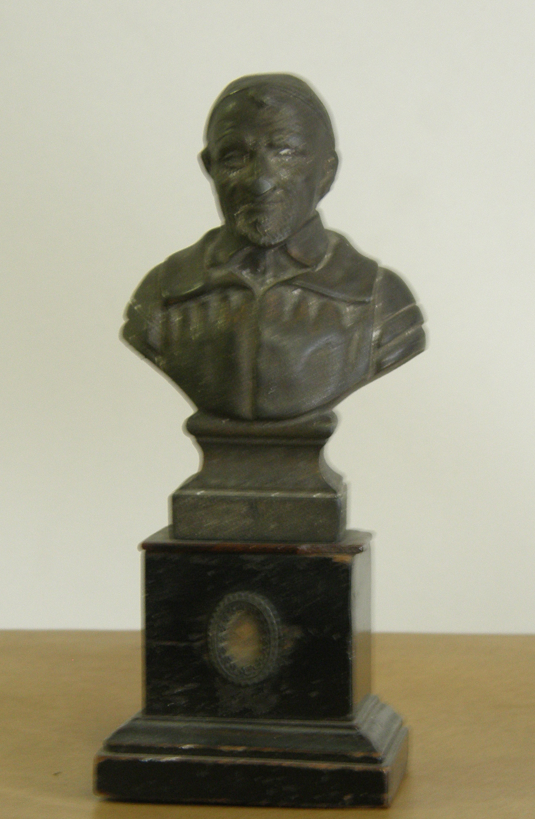 Bronze bust and reliquary, Vincent de Paul, cassock, mantle, skullcap; reliquary and relic below; original in Vincentian mother house