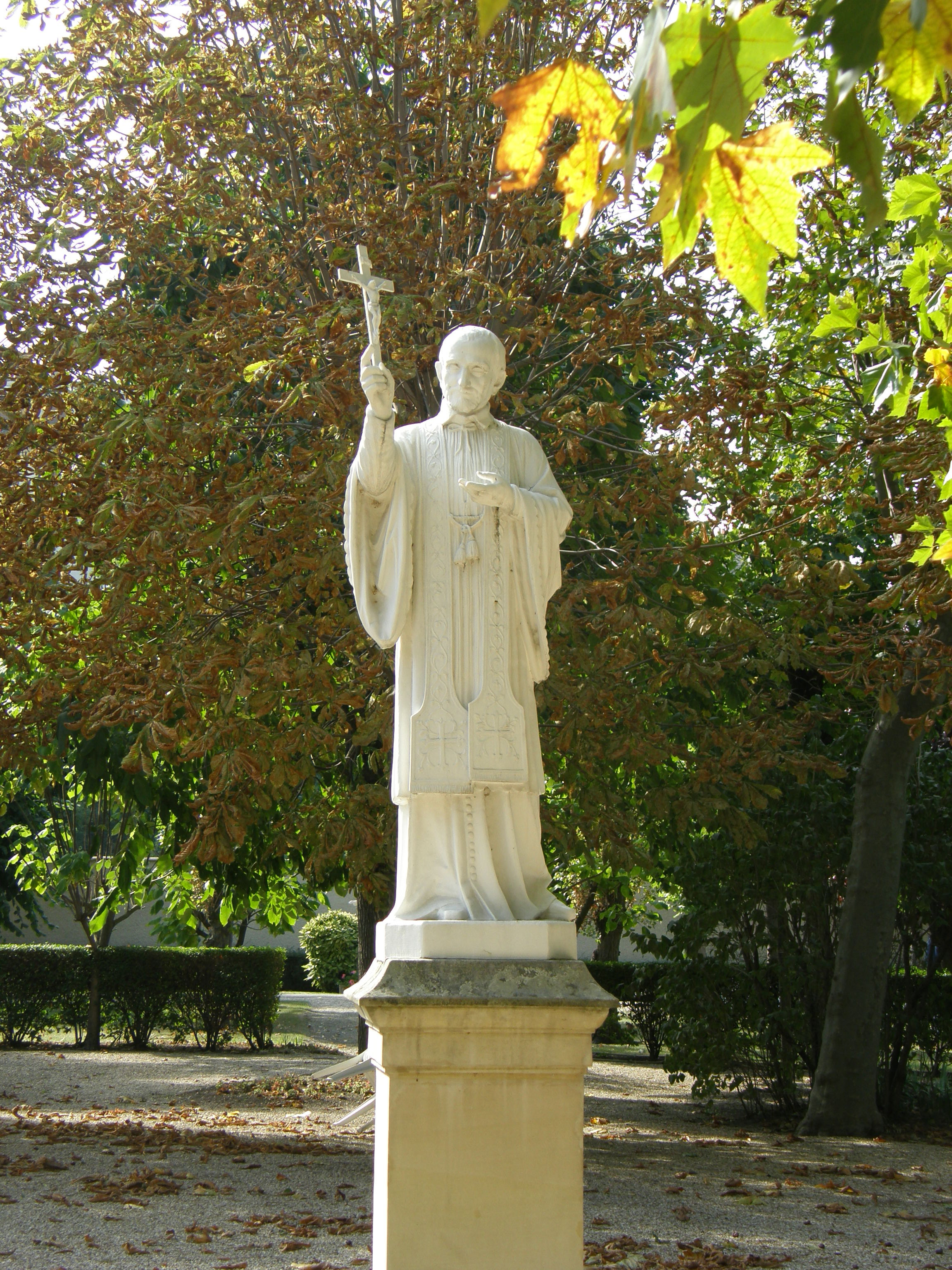 Statue, Vincent de Paul, cassock, wide-sleeve surplice, stole, gesturing toward crucifix in right hand; original in mother house of Daughters of Charity