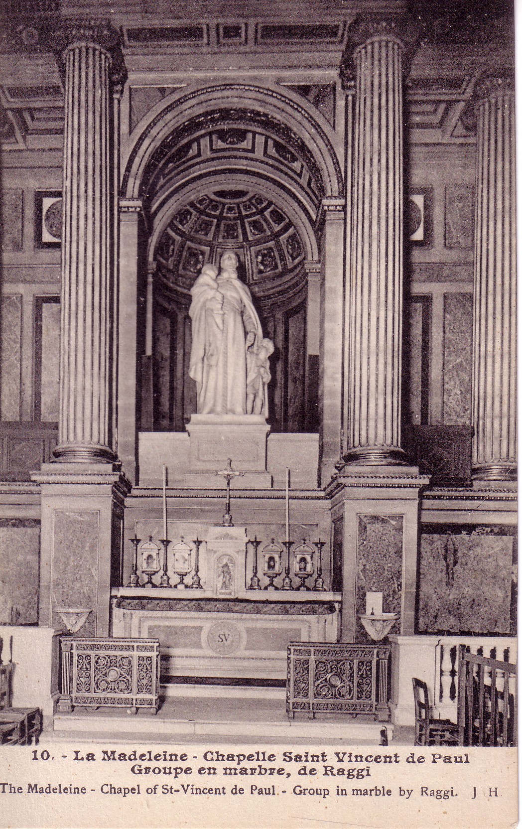 Marble statue, Vincent de Paul standing, cassock, cape, with two children; artist: Nicolo Raggi; original in La Madeleine, Paris; DePaul University collection
