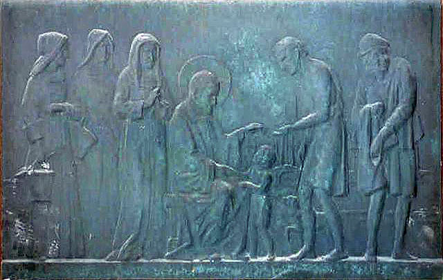 Bronze plaque, Vincent de Paul, seated, cassock, surplice, stole, skullcap, halo; Louise de Marillac standing, no halo; two Sisters; poor men, child; original in St. Joseph Hospital