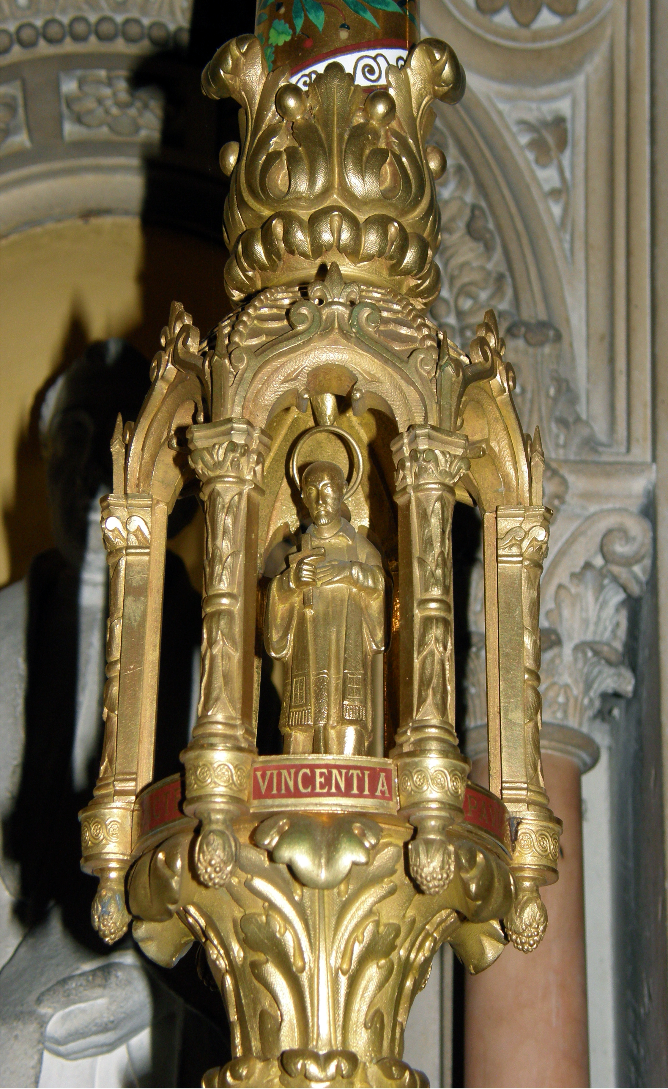 Text in Latin: St. Vincent de Paul, pray for us Vincent de Paul, standing, in cassock, surplice, stole, skullcap, halo, holding cross