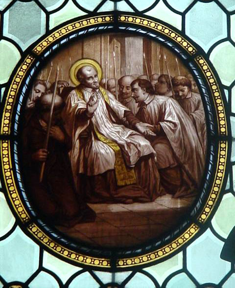 Vincent de Paul, dying, blesses his Community; Latin: "SV in extremis positus sacra communione reficitur." Window by Laurent and Gsel, Paris (no date)