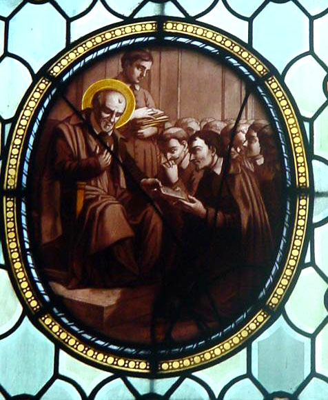 Vincent de Paul distributes Common Rules to priests; Latin: "SV, regulas spiritu Dei plenas missionariis tradidit." Window by Laurent and Gsel, Paris (no date)