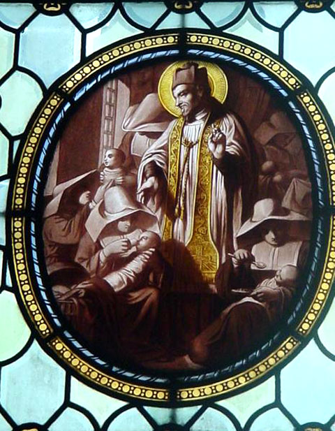 Vincent de Paul blesses Daughters of Charity, helping foundlings; Latin: "SV infantium expositorum vitae ac educationi providet." Window by Laurent and Gsel, Paris (no date)