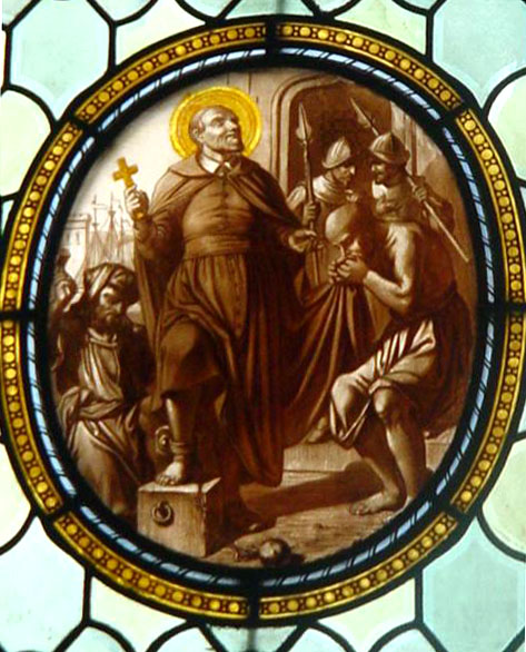 Vincent de Paul taking chains of galley convict, who kisses his cape, soldiers, ships; Latin: "SV miseri ad triremes damnati vincula suscipit ipsumque liberat."