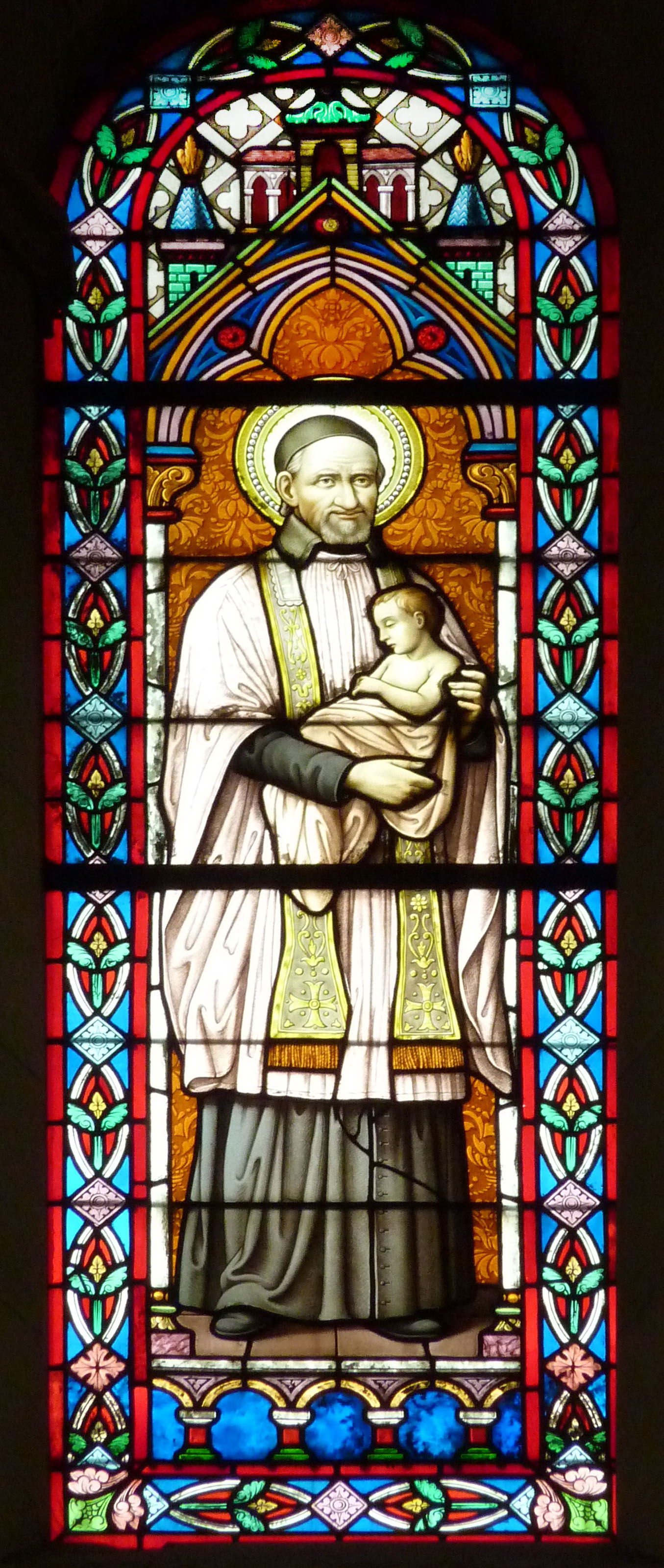 Vincent de Paul, standing, cassock, surplice, stole, skullcap, halo, holding child