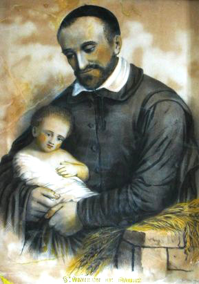 Reproduction of painting (or illustration); Vincent de Paul, cassock, mantle, skullcap, holding child; wheat stalks on stone ledge; location of original unknown; name below