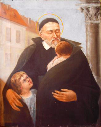 Painting; Vincent de Paul, cassock, skullcap, halo, folding two children in his cape; buildings in background; location of original unknown
