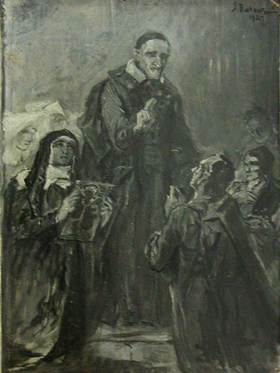 Painting, Vincent de Paul, cassock, mantle, skullcap, blesses Louise de Marillac with painting, Sisters, priests; original in Vincentian house, Stradom, Krakow; signed and dated 1927