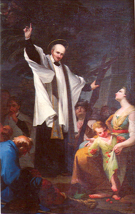 Reproduction of an altar painting, Vincent de Paul, cassock, surplice, violet stole; preaching with crucifix to crowd outdoors; Vincentian priest in background