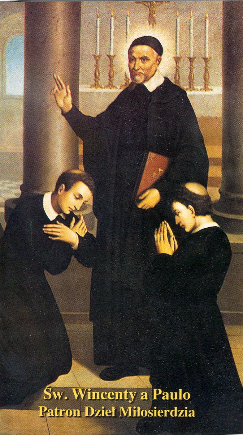 Reproduction of painting, Vincent de Paul, standing, cassock, cape, skullcap, holding book, hand raised in blessing; altar in background; two tonsured seminarians kneeling; original in Holy Family church, Tarnów; text: Patron of Works of Mercy
