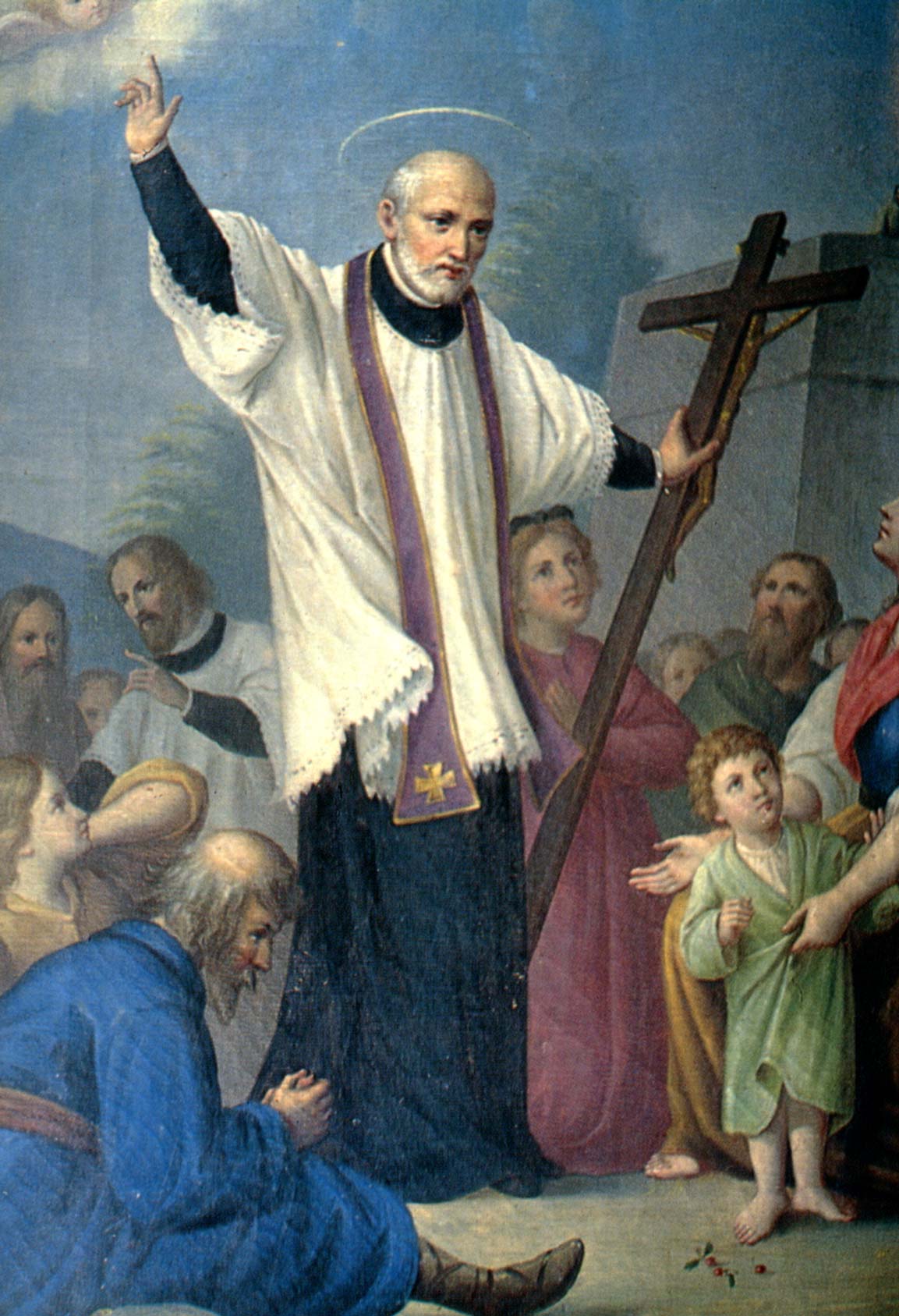 Painting; Vincent de Paul, standing, cassock, surplice, violet stole, holding large crucifix; preaching to crowd outdoors; Vincentian priest in background; location of original unknown