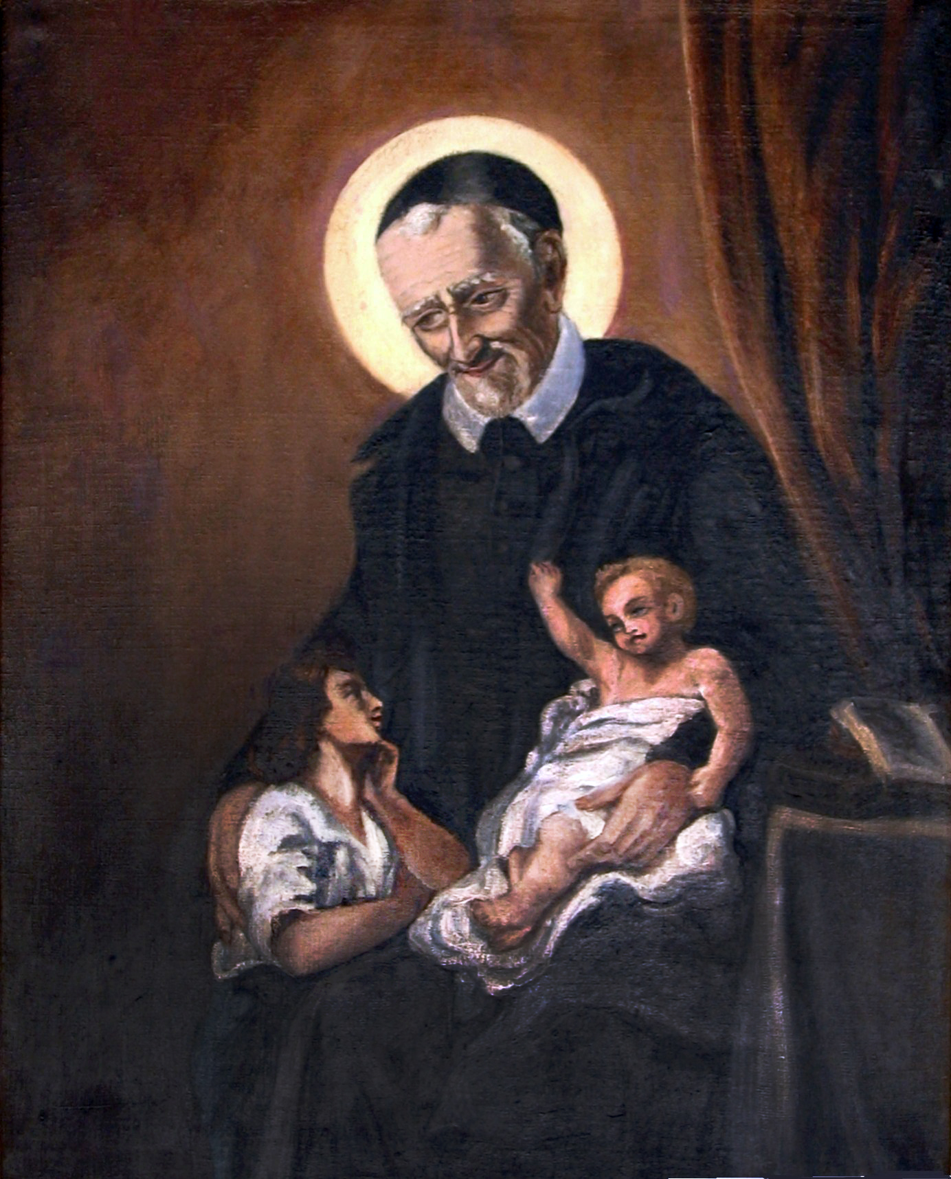 Oil painting; Vincent de Paul seated, casock, mantle, skullcap, halo; with two children; original in Krakow