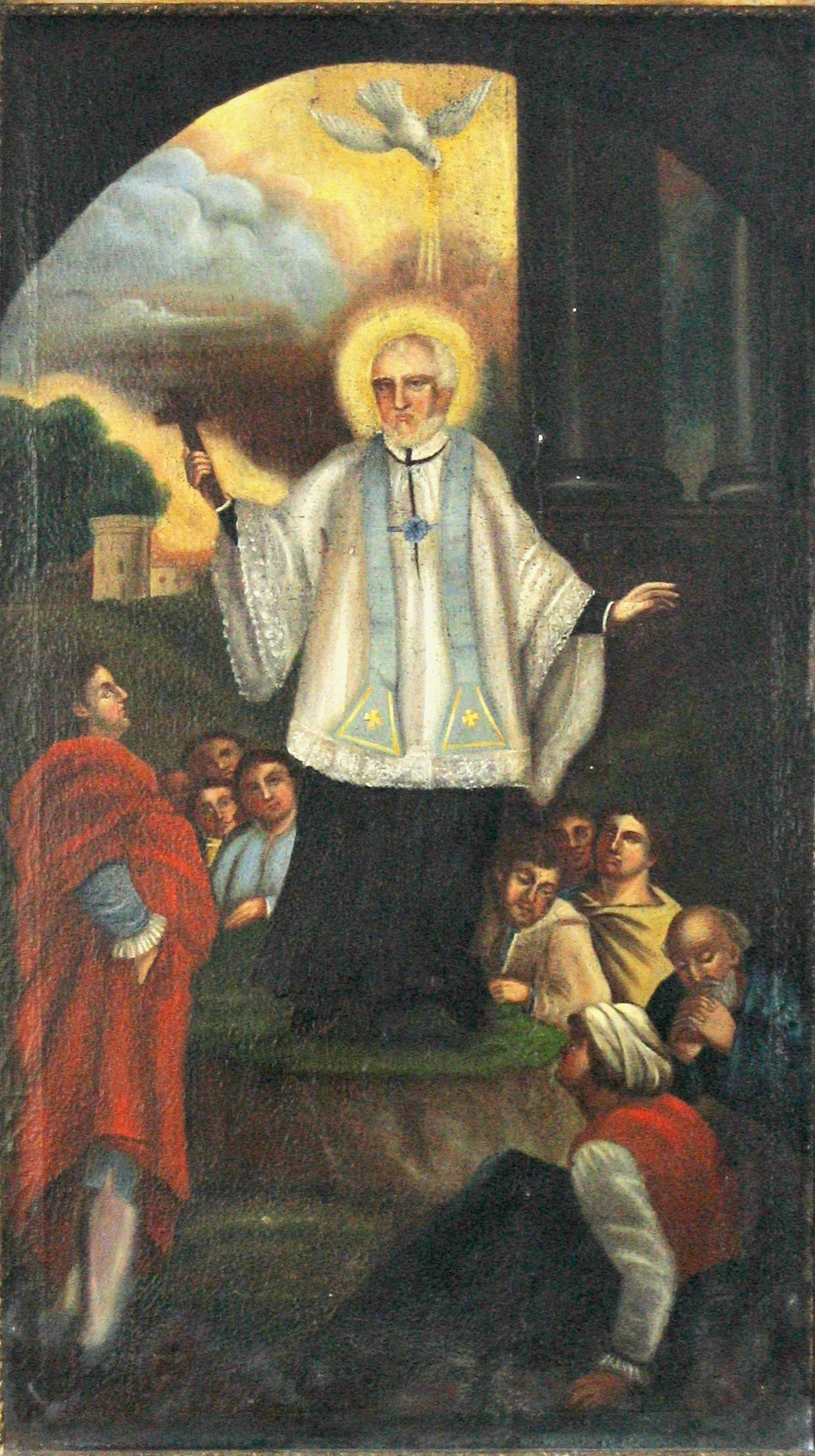 Based on Italian models of Vincent de Paul, light blue stole, holding crucifix, preaching outdoors in rural setting; original in Daughters of Charity provincial house, Warsaw; early 19th century