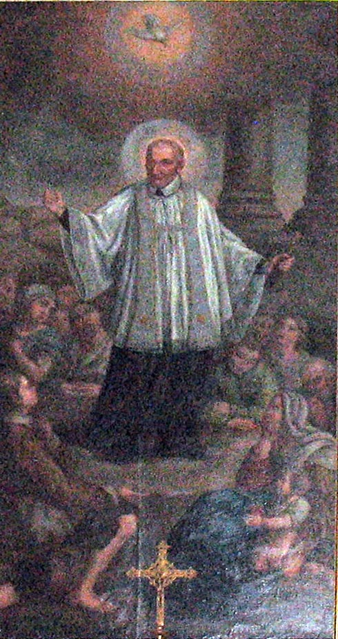 Vincent de Paul, standing, cassock, short surplice, white stole, holding crucifix; Holy Spirit symbol above; altar painting in former CM church in Tykocin