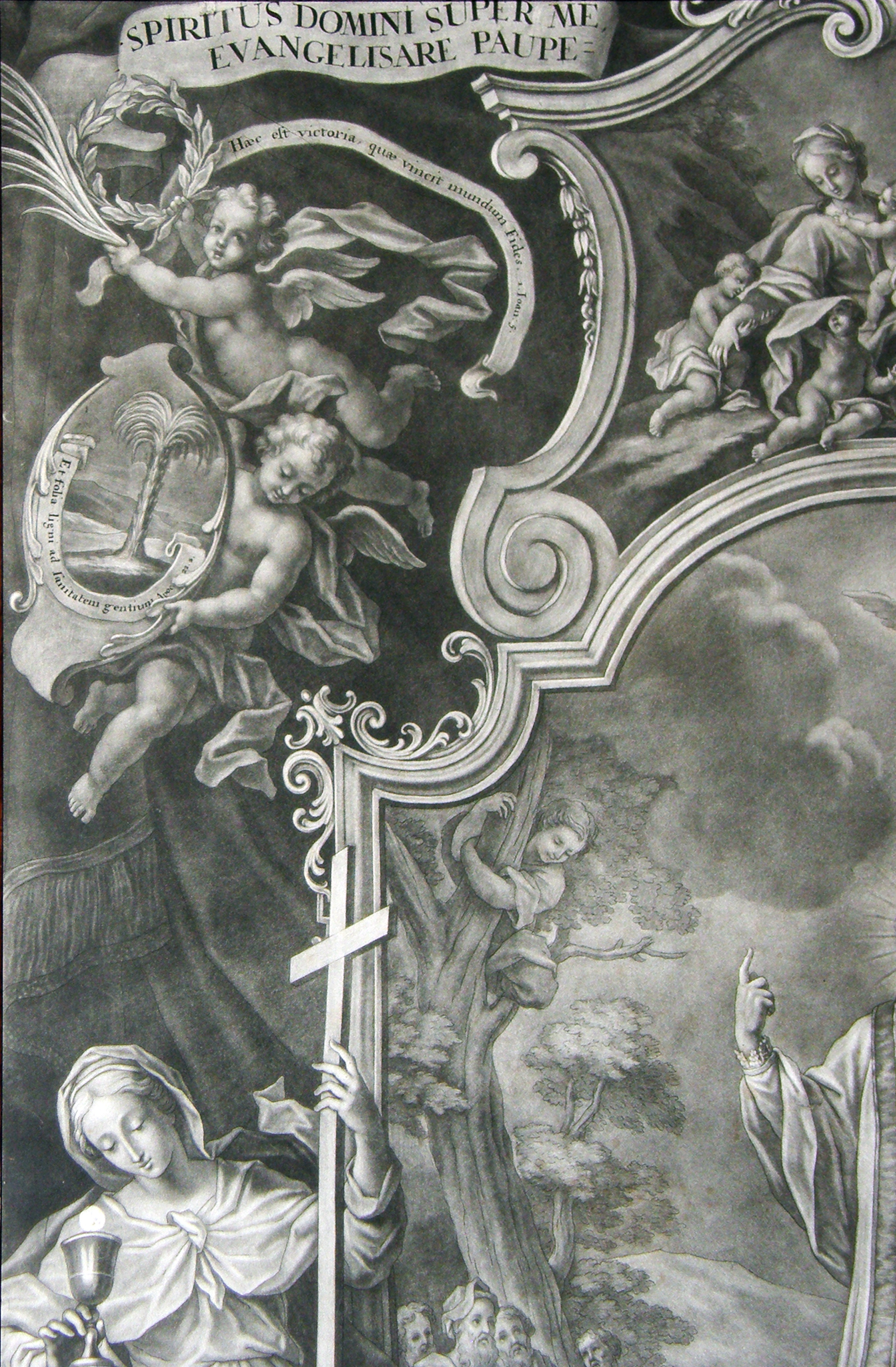 Text (ribbon): Haec est victoria quae vincit mundum fides [nostra] (1 Jn 5:4)Text (oval): Et folia ligni ad sanitatem gentium (Rev 22:2), = medicines, hospital careFemale figure, cross, chalice, host.