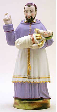 VdP, violet cassock and skullcap, white surplice w/ gold; infant; raised arm serves as a spout. Porcelain in three pieces (skullcap, bust, lower body); 19th c., French; internet image; formerly in Sparta Teapot Museum; now Teapot Collection, Trenton, TN