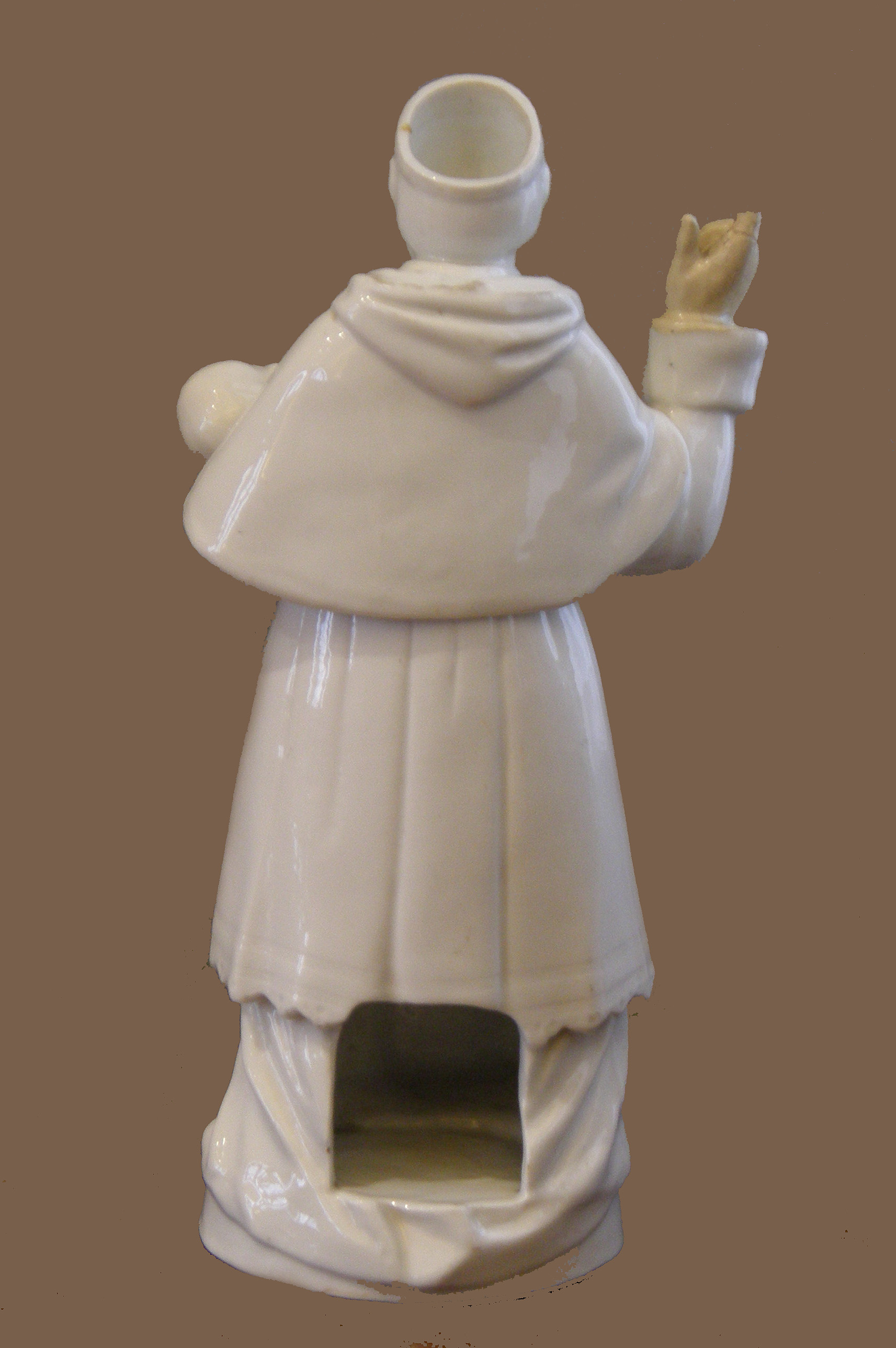 Glazed porcelain, Vincent de Paul tea pot, removable skullcap, top of body removable, opening for coal to warm water; original in Vincentian mother house, Paris