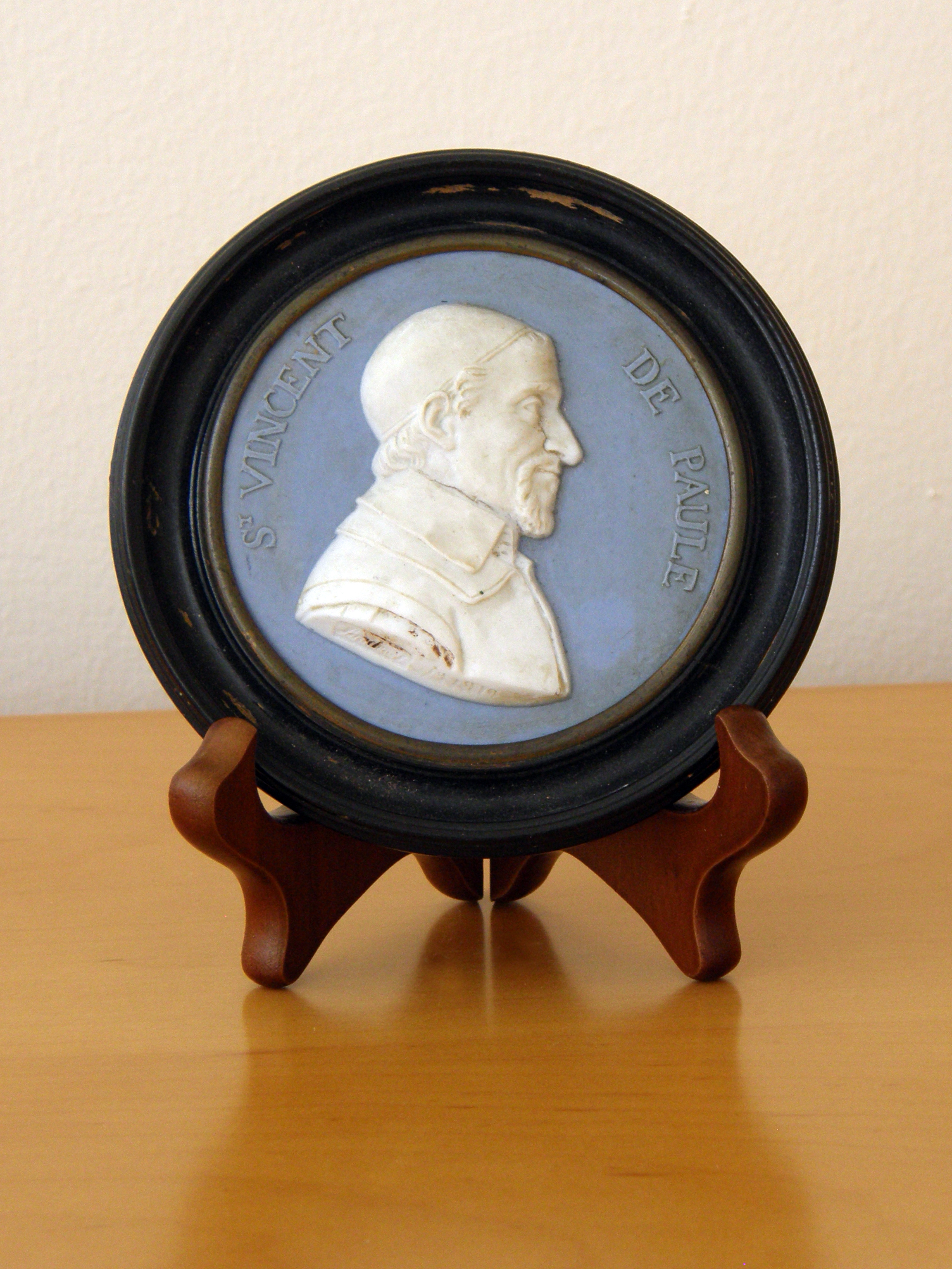 Vincent de Paul bust in profile, cassock, mantle, skullcap; name spelled "Paule"; maker unknown; original at DePaul University