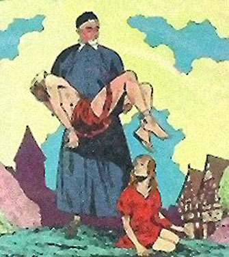 Cartoon drawing; Vincent de Paul, standing, cassock, skullcap; carrying poor man, girl sitting, exterior setting; perhaps in Vincentian provincial archives, Lisbon; see also Netherlands version in this collection