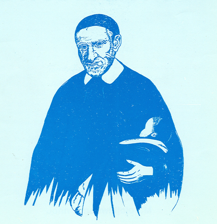Vincent de Paul, standing, cassock, cape, skullcap; with sleeping child in his arm; prepared for publication in Indonesia