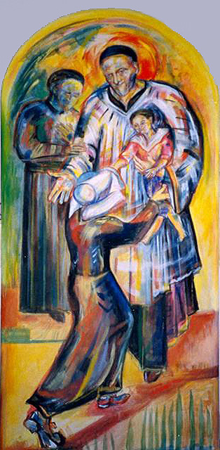 Oil painting; Vincent de Paul, standing, in cassock, surplice, skullcap, presents orphan child to Daughter of Charity; priest in background; original in college chapel, Antoura
