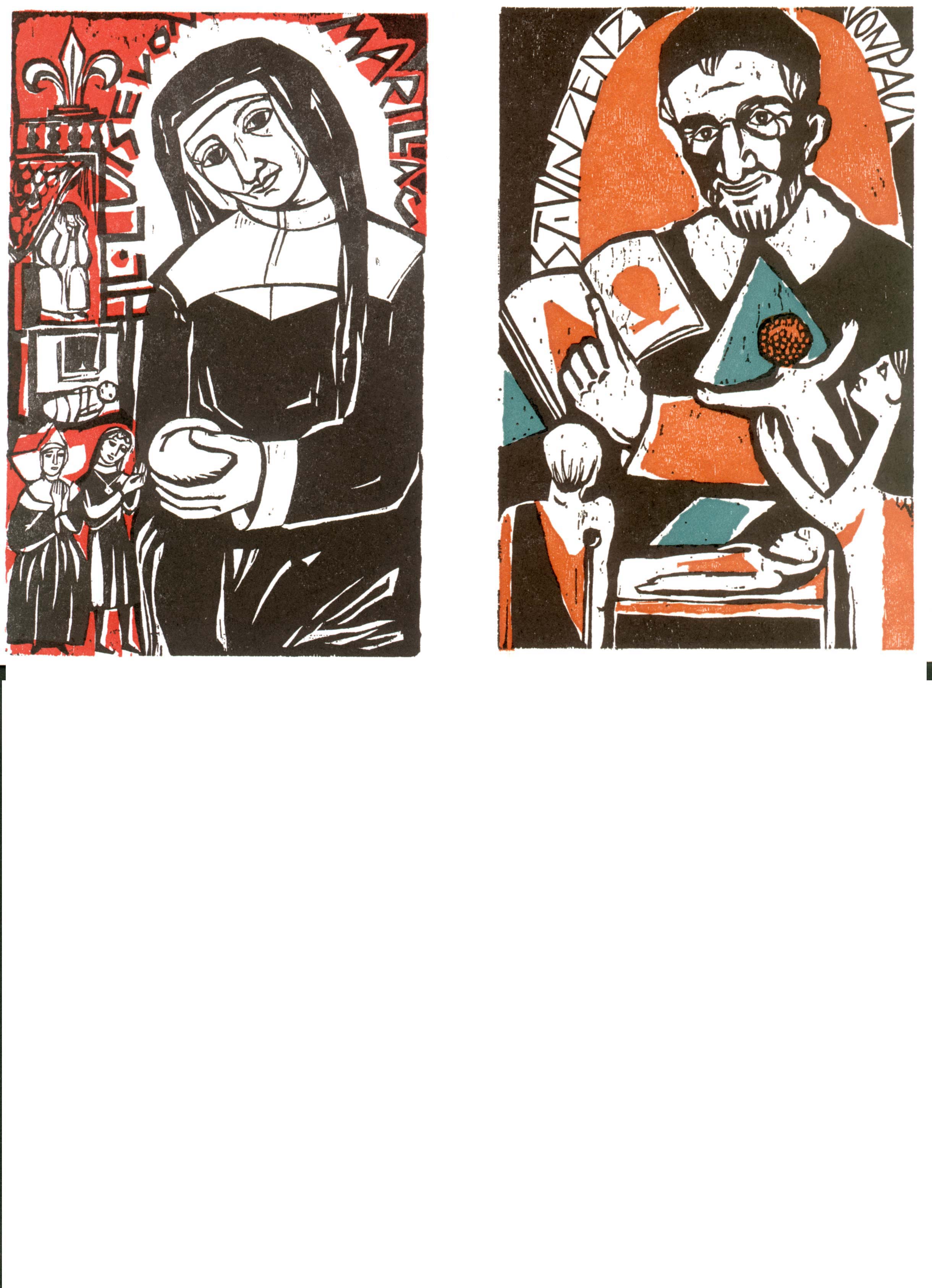 Printed card, woodcut prints, Vincent de Paul teaching, Louise de Marillac distributing food; original done in Austria