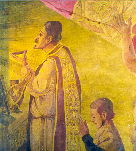 Mural painting; Vincent de Paul standing at altar, celebrating his first mass; kneeling altar server behind; original in Vincentian parish, San Juan