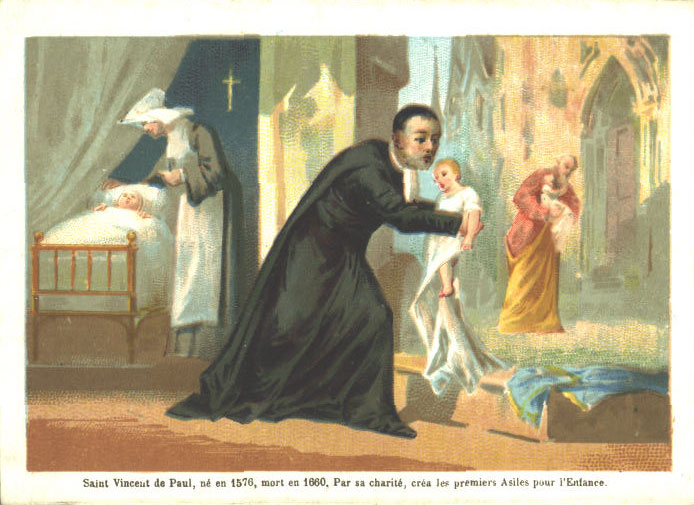 Text: SVdP, born 1576, died 1660. Through his charity, he created the first asylums for children