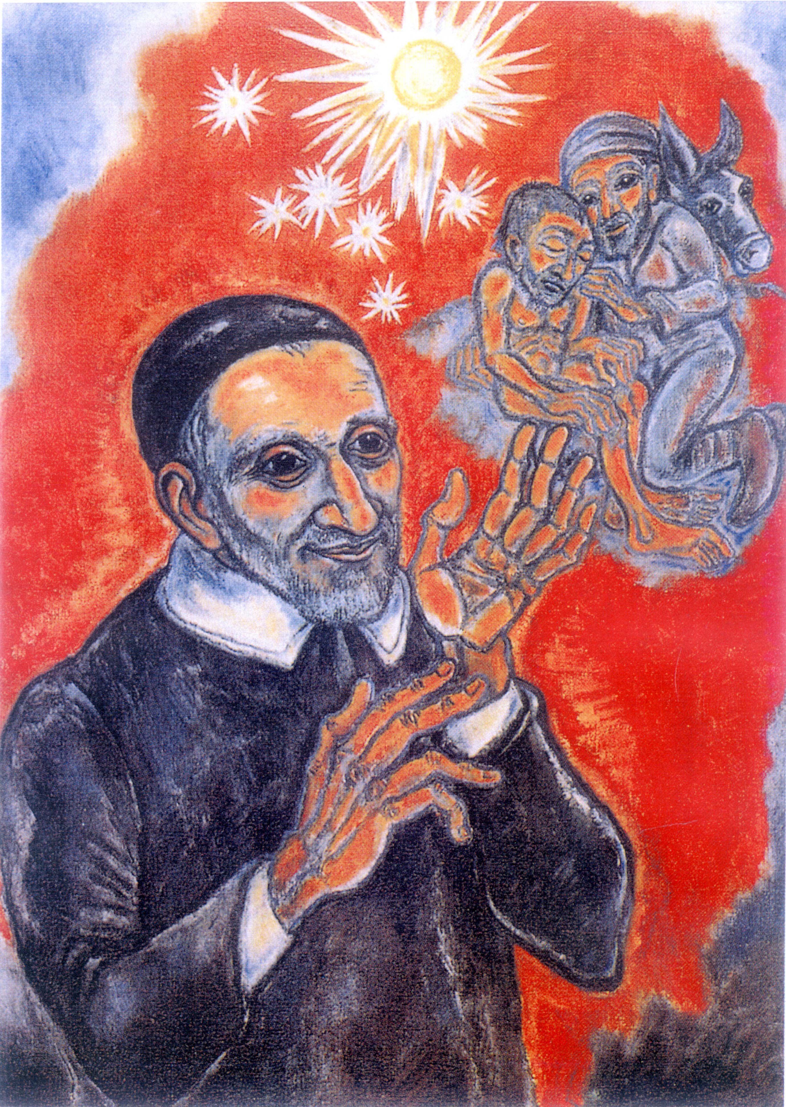 Painting; Vincent de Paul, cassock, shirt sleeves, skullcap; reflecting on Good Samaritan, stars in background. Original at St-Georg College, Istanbul; another in Untermarchtal, Germany; artist: Walter Habdank