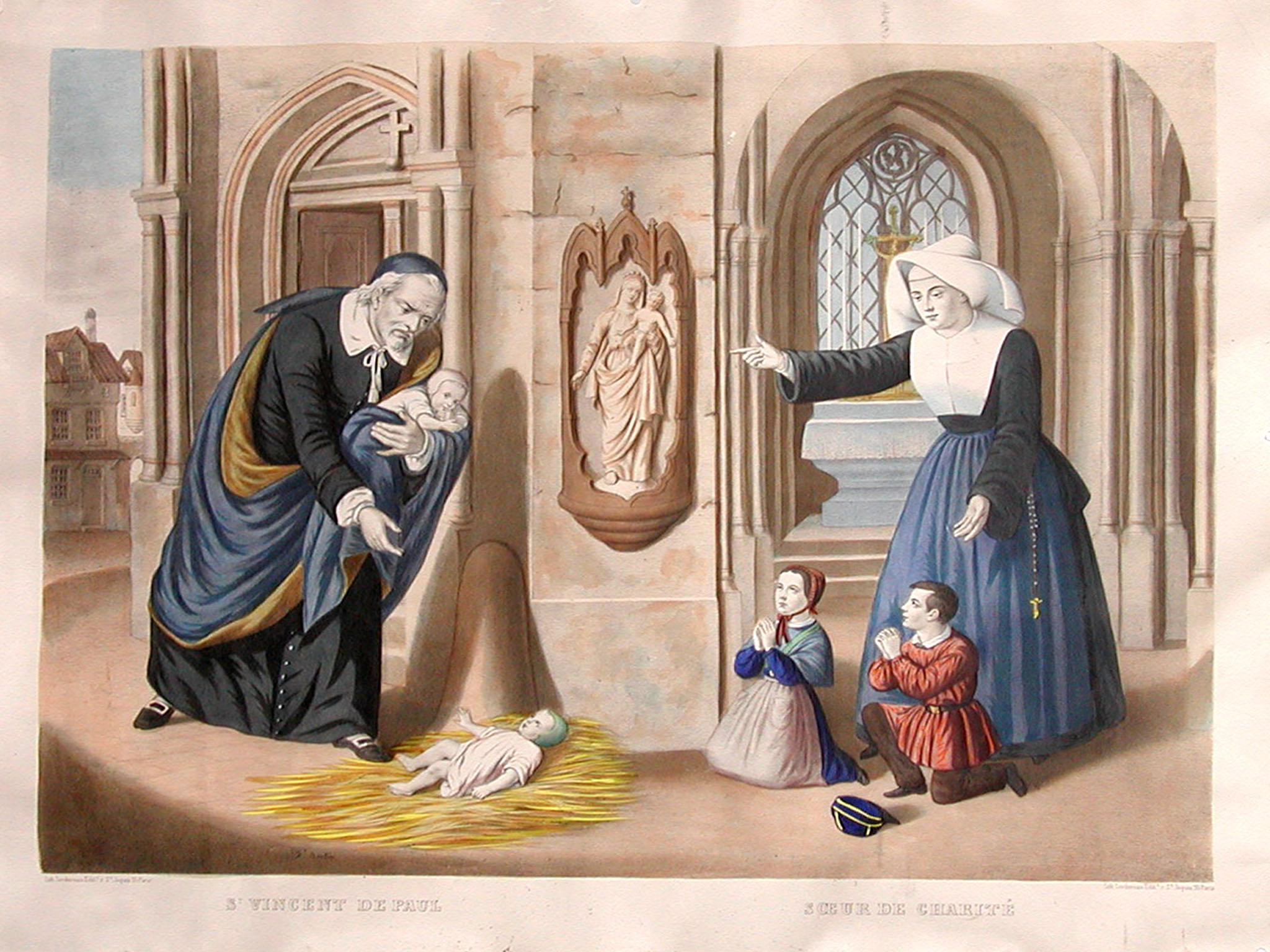 Colored print; Vincent de Paul, standing, cassock, blue cape with brown lining; skullcap, gathering foundlings; Daughter of Charity with two kneeling children before a church; Vincentian motherhouse museum, Paris